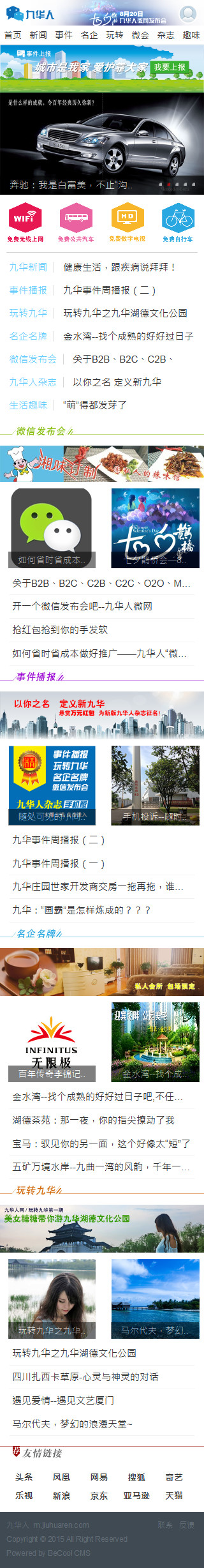 “九華人”微信公眾號和微網站是由湘潭市貝一科技科技有限公司、湖南云擎科技及智慧九華綜合管理中心三方共同設計開發,此項目集合了新聞資訊類欄目和智慧九華的“事件上報”系統,并將移動網站與微信進行了整合。